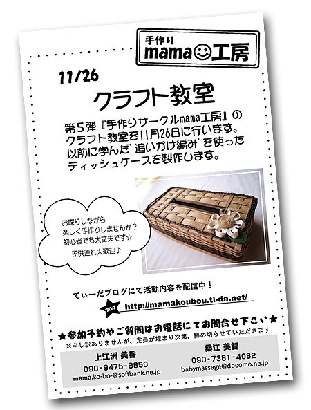 コミュのみなさま、こんにちは〜 今月のクラフト教室は、ご要望のあったティッシュケースを追いかけ編みで作ります。 今回もキット+講習代、mama工房の手作りお菓子&飲み物などすべて込みで2000円です。 定員は10名で、定員に達し次第締め切らせていただきます。 お待ちしております!!