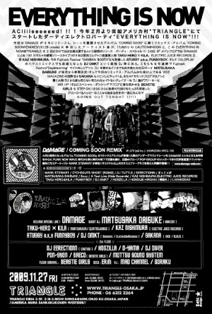 今回はDAMAGEが4月にリリースし、シーンを震撼させたアルバム"COMING SOON"に続くリミックス・アルバム"COMING SOON REMIXIES"(10.28 on sale)に参加したアーティスト達が、11/6(fri)のCAUTION@NOONと、このEVERYTHING IS NOW@TRIANGLEの2回に分けてほぼ全員出演するという破格のリリース・パーティ・スペシャル !!!