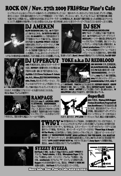 SLOW BURNING INC.× CANISTAR SOUND presents 『ROCK ON』 @STAR PINE'S CAFE KICHIJOJI OPEN 23:30 -DJ'S- DJ AMEKEN DJ SEN DJ UPPERCUT YOKE a.k.a DJ REDBLOOD DJ YOKO aka JILL -DANCE SHOW CASE- RAMPAGE(RYOSUKE,AKIHIRO) Superball(Harima,Zukkey,Shu) FOXY MARTINI -SPECIAL LIVE- TWIGY SYZZZY SYZZZA DERELLA At Door 2,500yen (1drink+MixCD先着30名) With Flyer2,000yen (1drink) more info: STAR PINE'S CAFE 0422-23-2251 ※通常のフライヤー(レッドバージョン)持参で500yenオフの2000yen(1drink)で入場出来ますが、この