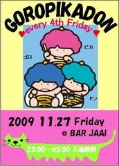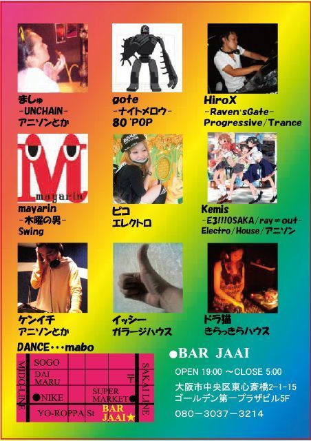 11月のゴロピカドンのお知らせです☆☆ ゴロピカドン 2009/11/27 (Fri) Open: 23:00 Close: 5:00 場所: 東心斎橋 BAR JAAI 大阪市中央区東心斎橋2-1-15 ゴールデン第一プラザビル5F Charge FREE!! ☆ゴロピカクルー☆ DJ ●まUゅ -UNCHAIN- (J-POP) ●Kemis -E3!!!OSAKA / ray≠out- (Electro / House / アニソン) ●gote -ナィトメロゥ- (80'sPOP) ●mayarin -木曜の男- (Swing) ●HiroX -Raven's Gate- (PROGRESSIVE / TRANCE) ●ピコ -LIFE SIZE RECORD- (エレク