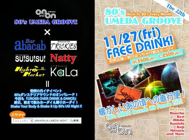 管理人様、イベント告知失礼致します。 2009/11/27の金曜日は・・・DISCO的夏祭り 80'sUMEDA GROOVE!!終日飲みホーダイ! さぁ飲み放題&ミッドナイトビンゴで盛り上がりましょ〜 11月27日(金) [NIGHT] 20:00 ~ LATE M/3500- L/2500- Free Drink Disco/Dance/Soul/80’sサウンド/all Mix Houchu, ken yoshida, HIBIKI NAKAHARA (Delaction). 時代は1980年・・・DISCO全盛期に活躍していたDJ陣によるSUPER FRIDAY NIGHT ソウルも、ユーロも、ディ