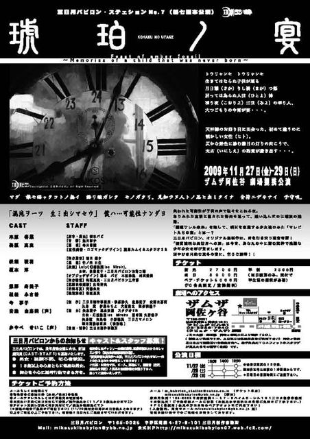 増す寒さに月も冴え増すこの頃、皆様如何お過ごしでしょうか。 三日月バビロンより、11月本公演のお知らせをさせていただきます!。 櫻木バビ・オリジナル最新作は・・・時を行き交う迷宮奇譚! 切なくもどこか懐かしい、心があったかくなるファンタジー!。 どうぞ心に大事な方を連れて、真冬の一時を三日月バビロンでお楽しみ下さい。 皆様お誘いあわせでのご来場を、メンバー一同心からお待ちいたしております。 (三日月バビロン・メンバー一同) 三日月バビロン・ステ
