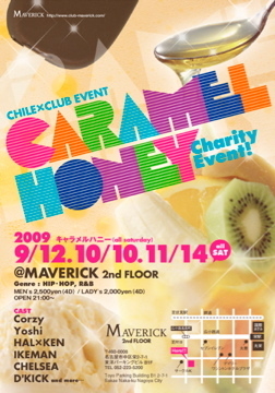 CARAMEL HONEY (HIP・HOP R&B ROCK) @MAVERICK 2ndfloor OPEN21:00〜 画像を受付で見せると… MEN 2000YEN 2DRINK LADY 1500YEN 1DRINK CAST DJ Corzy YOSHI HIYA LIVE HAL×KEN JSE DANCE Sugar pod 栗きんとん ボランティアブース チャイル 毎回、アットホームな雰囲気と甘い時間を提供してますボランティアイベント 「キャラメルハニー」 楽しむ事こそがボランティア