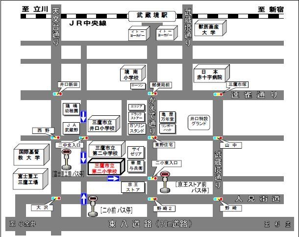日 程:11月27日(金) 場 所:三鷹市立第二小学校 住 所:〒181-0014 東京都三鷹市野崎3-19-1 交 通: ○中央線 ◆武蔵境駅南口 2番境92 吉祥寺駅東口行き 「京王ストア前」下車 徒歩2分 3番境91 調布・狛江営業所行き 「富士重工前」下車 徒歩3分 4番境01 吉祥寺駅南口行き 「二小前」下車 徒歩2分 ◆三鷹駅南口 8番鷹52 朝日町行きまたは車返し団地行き 「二小前」下車 徒歩2分 ○京王線 ◆調布駅北口 11番境91 武蔵境南口行き「富士重工前」下車 徒歩3分 時 間:18:30〜21:00 費 用:100円 シューズは室内用