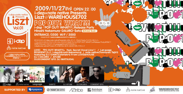 i-dep&note nativeのレギュラーParty『Liszt』 01回目麻布十番WAREHOUSE702で開催!! し・か・も開催日の11/27はi-depナカムラヒロシのバースデー みんなでお祝いしちゃいましょう 東京公演でしか見れない i-dep『POP OUT! WHAT!!!』 feat.Secret Vocal Liveは必見ですぞ!! 皆様是非遊びに来て下さい!! Lisztコミュニティー作りましたのでご参加下さい! 『Liszt』 http://mixi.jp/view_community.pl?id=4647130 Liszt@WAREHOUSE702 PV By CONSENT GFX(VJ MAZDA) 2009/11/27(Fri) OPEN 22:00