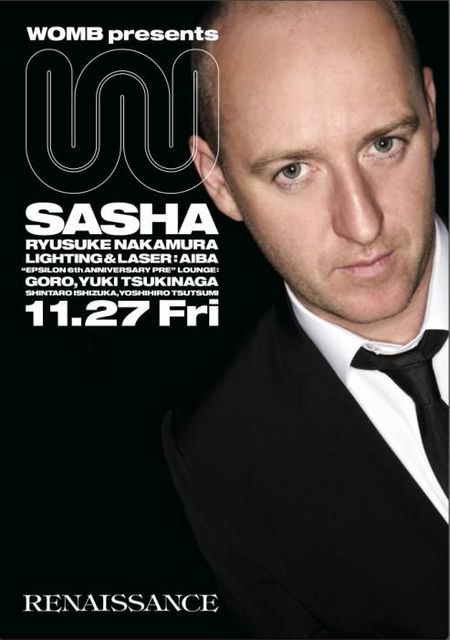 管理人様、告知失礼致します。 11/27(FRI) WOMB presents W RENAISSANCE feat. SASHA LINE UP: SASHA OPENING: RYUSUKE NAKMURA (EPSILON) LIGHTING + LASER: AIBA EPSILON 6th ANNIV. PRE LOUNGE: GORO, YUKI TSUKINAGA, SHINTARO ISHIZUKA, YOSHIHIRO TSUTSUMI OPEN: 23:00 DOOR: \4000 MUSIC: HOUSE 3週に渡って開催する"WOMB presents W"の最終週に、満を持して登場をするのは、"W"の記念すべき第1回目のアーティストでもあり、実力、人気共に正に世界のNo.1アーティストに君臨するキング、SASHAが君臨!!!WOM
