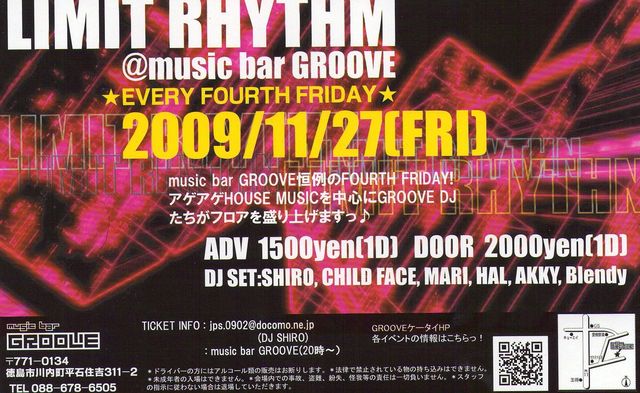 管理人様、告知失礼します! [HOUSE&TECHNO PARTY!!] LIMIT RHYTHM @music bar GROOVE 2009/11/27(Fri) ★EVERY FOURTH FRIDAY★ START 21:00〜 ADV *1500yen(1D) DOOR*2000yen(1D) ******* musicbarGROOVE恒例の FOURTH FRIDAY!! アゲアゲHOUSE MUSICを 中心にGROOVE DJ達が フロアを盛り上げますッ! ******* DJ―――→ SHIRO CHILD FACE MARI HAL AKKY Blendy *ドライバーの方には、 アルコール類の 販売はお断わりします。 *法律で 禁止されている物の 持ち込みはできません