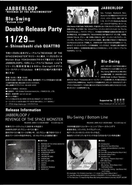 今秋11/4に全米デビューアルバム“REVENGEOF THE SPACEMONSTER” をリリースするJABBERLOOPと、10月にニューアルバム“Bottom Line” をリリースし関西初登場となるBlu-Swing とのダブルリリースパティー!ClubJazz を牽引する2組が大阪の夜を熱くする!