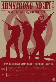 告知失礼します。 2009年11月29日(日) ARMSTRONG NIGHT vol.8 @KIETH FLACK BAND Warnings! DISOBLiGE My Pleasure ジャンプ解体 JUST LIKE ME BORSCH Develop One's Potential MxFxF(久留米) URBAN HEAD RAW(北九州) ChAKa(日田) DISSECT(下関) DJ Kiyo-Shit(剛腕) Y.S.N(KIETH FLACK ROCKS,SANTERIA) ERI(Scrubbrush,Background) JUNK(THE SCHOOL DAYS) TOMO(SHAKE IT UP/福井) Ticket adv/door1500+1Drink OPEN16:00 BAND START18:00 HP ARMSTRONG NIGHT http://ip.tosp.co.jp/i.asp?I=armstrongnight 剛腕record http://ip.tosp.co.jp/