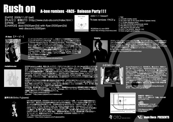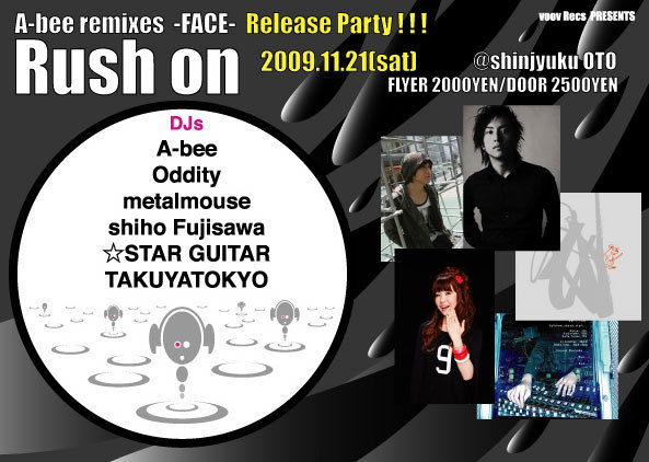『A-bee remixes -FACE- 』リリースパーティー!! "Rush on" 今週土曜日! 【DATE】2009/11/21(sat) 【PLACE 】 新宿OTO(http://www.club-oto.com/index.html ) 【OPEN】 22:00~ 【CHARGE】door/2500yen(2d) with flyer/2000yen(2d) web discount/2000yen(2d) 参加DJ A-bee Oddity metalmouse Shiho Fujisawa ☆STAR GUiTAR TAKUYATOKYO 待ち受けFlashでディスカウント!!!500円OFF こちらのFlash画像を携帯にダウンロードして、入場時にお見せ下さい。 携帯ダウンロードアドレス http://voovrecs.