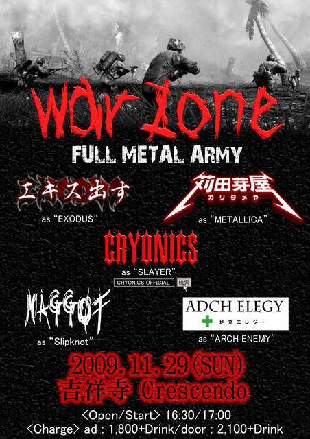 11月29日(日)、吉祥寺CRESCENDOにてCRYONICS主催でメタル系カバーイベント“WAR ZONE Vol.1 〜Full Metal Army〜”を開催することとなりました。