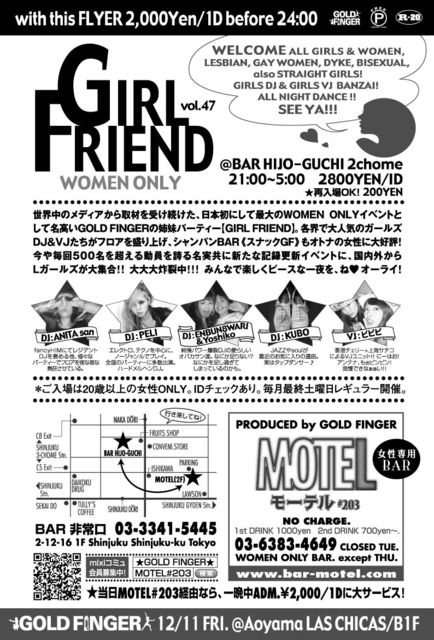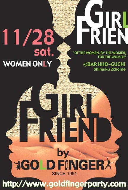 GFはモーテル経由で一晩中お得に!!!>>>>> GFの後もGF!!!非常口〜リハブ@2丁目をオールナイトでエンジョイ★ いよいよ今週末!11/28(土)は<GIRL FRIEND by GOLD FINGER>@BAR非常口(新宿2丁目) 世界中のメディアから取材を受け続けた、日本初にして最大のWOMEN ONLYイベントとして 名高いGOLD FINGERがお贈りする姉妹ラウンジPARTY! 各界で大人気のガールズDJ&VJたちがフロアを盛り上げ 国内外からイケテルLガールズたちが大集合〜〜! オトナの女性には大人気シャンパンBAR《スナックモーテル@GF支店》もご用意! 毎月大