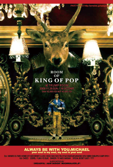 room of KING OF POP 全てはMICHAELに捧げる 感謝の気持ちと永遠の気持ちと共に… 同志へのSPECIAL EVENT 1958〜∞ 11月29日(日) 16:00〜22:00 渋谷TRUMP ROOM (site) \2000 1D w/ flyer \2500 1D [16 DJs] MichaelFREAK J-WAVEでお馴染みの DJ TAROサン DJ TARO / MONDO / HOME CUT / SOCCER BOY / U.I.R.O. OCHII / ISHII / SHO / HYUK / DUB DUB SUNSHINE / TAI KEN / SIM69 / DABURYU / CARP / RYO÷ [VJs] SHOCO / A&W DESIGN [GOSPEL SINGER] YUMI+Y0-SUKE [DANDER] 51 (AKI
