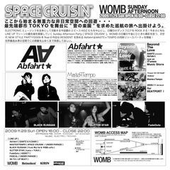 都内で活躍中の旬なユニットアーティストを中心にWOMBのサンデーアフタヌーンを盛り上げるSPACE CRUISIN’@WOMBの2009FINAL Gig! 今回はResidentのAbfahrt&MASTEяTEMPOの同時新曲リリースパーティを開催! ※今回はメインフロアのみの開催になります。 mixiの予約にて限定価格1000円で御招待! 直接私まで連絡ください。 (代表者のお名前と人数を下さい) この機会に是非体感してください。 2009/11/29 (SUN) SPACE CRUISIN'@ WOMB -Abfahrt&MASTEяTEMPO RELEASE PARTY- Open/16:00〜Close/22:00 Sun