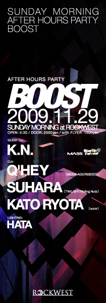 管理人様、告知を失礼致します。 2007年より「REBOOT」のAFTER PARTYとしてスタートし、今やROCKWESTの最重要AFTER HOURS PARTYの一つとなり3年目を迎えた「BOOST」!Q'HEY & SUHARAをレジデントに、KOO & KATO RYOTAがサブレジデントで参戦!そして今回はACID TECHNOの代名詞、MASS UNITEDよりK.N.が登場!刺激的過ぎる朝をお約束します! AFTER HOURS PARTY BOOST 2009.11.29 (SUN. MORNING) open 5:30 door: 2000yen / with FLYER 1500yen venue: ROCKWEST GUEST DJ: K.N. (MASS UNITED/Stay Up Forever) DJ: Q'HEY (MOON