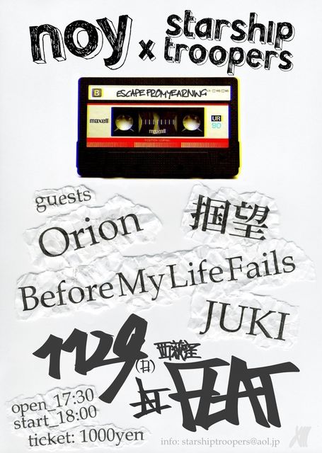 告知失礼致します。 不適切な場合は削除お願い致します。 2009年11月29日(日)西荻窪flat STARSHIPTROOPERS × noy presents **ESCAPE FROM YEARNING** OPEN17:30 START18:00 ADV/DOOR\1000 STARSHIPTROOPERS http://www.starshiptrooperstyo.blogspot.com/ noy http://www.myspace.com/noy2008 ORION http://www.myspace.com/orionjap 掴望 http://www.myspace.com/kakubou BEFOREMYLIFEFAILS http://www.myspace.com/beforemylifefails Juki http://www.myspace.com/juki