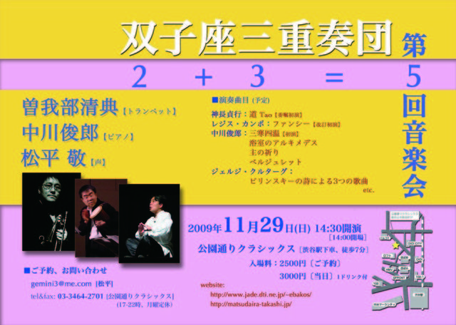 年に一度のお楽しみ・双子座三重奏団のライヴのお知らせです。 みなさま、どうぞお見逃しなく! ★双子座三重奏団 第5回音楽会★ とき:11月29日(日)14:30開演 [14:00開場] ところ:渋谷・公園通りクラシックス [渋谷駅下車、徒歩7分] 入場料:2500円 [ご予約] 3000円 [当日] 1ドリンク付き 出演:松平敬(vo)、曽我部清典(tp)、中川俊郎(pf) ■演奏曲目(予定) 神長貞行:道 Tao [委託初演] レジス・カンポ:ファンシー [改訂初演] 中川俊郎:三寒四温 [初演] 浴室のアルキメデス 主の祈り