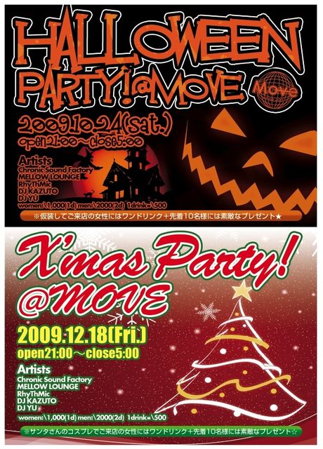 尼崎市最大のダーツバーがクラブに変わりクリスマス一週間前の夜を皆で盛り上がりましょう!!! HIPHOP、R&B、RAGGAEを中心としたクラブミュージックで尼崎で一番HOTな夜を!!! 今回も大阪、神戸で活躍しているChronic Sound Factory に店を盛り上げてもらいます!! クリスマスイブイブイブ・・・・素敵な出会いがあるといいですね☆ 今年の年末イベントの始まりはMOVEで!! ●X’mas Party!@MOVE ● ■2009.12.18(FRI.) ■OPEN21:00〜