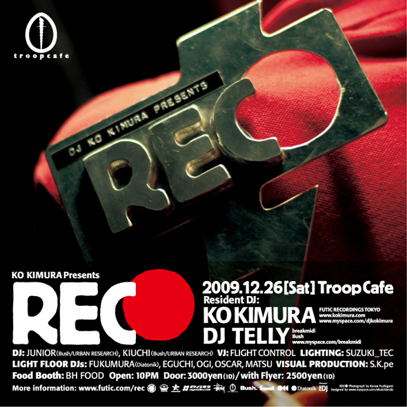 管理人様 失礼します。 絶えず時代の先端を見据えながらカッティングエッジな選曲と卓越したスキルでプロとして24年DJし続けてきたKO KIMURA。そのKO KIMURAのホームグラウンドとなるレジデントパーティーがREC●だ。技術の進歩とともに変化するDJテクノロジーをいち早く取り入れてきたKO KIMURAは数年前からPC DJでプレイしているが、REC●ではこのデジタル音源のみによるDJという現代のDJスタイルをフィーチャー。DJブースにもはやターンテーブルはなく、サウンドシステムはデジタルサウンドのダイナミズムを最大化すべく特別にチューニング。オ