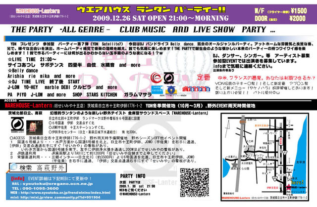 YDN プレゼンツ 参加型 パーティー第7弾(YDN Satellite7) 今回はDJ バンドライブ、Belly dance 混合のオールジャンルパーティ。アットホームな雰囲気と良質な音、光で、様々な出会いを演出、ホームパーティ感覚で音楽の垣根を越え、誰でも気軽に楽しめます!THE PARTYで誕生会のような懐かしい本来のパーティーの持つワイワイ感を楽しめます!!皆で作
