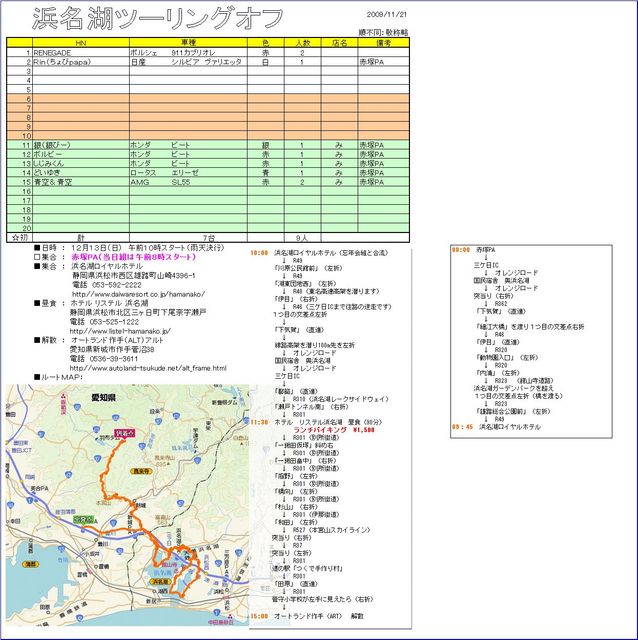 ◆O.P.E.N.忘年会2009◆ ■日時 : 12月12日(土)忘年会 ■宿泊場所 : 浜松 コンドミニアム舘山寺 http://www.yadoplaza.com/portal/PO10010?hotel_id=H000004481&mode=3 ■宿泊定員 : 2LDK。8名。人数が多くなった場合はもう一戸予約。 寝袋持参で雑魚寝ならもう少し可能。 ■食事 : え〜ちゃんシェフによる牛テール鍋 ◆浜名湖ツーリングオフ◆ ■日時 : 12月13日(日) 午前10時スタート(雨天決行) □集合 : 赤塚PA(当日組は午前8時スタート) ■集合