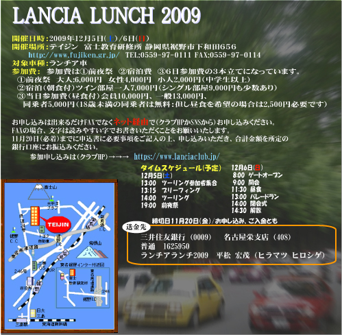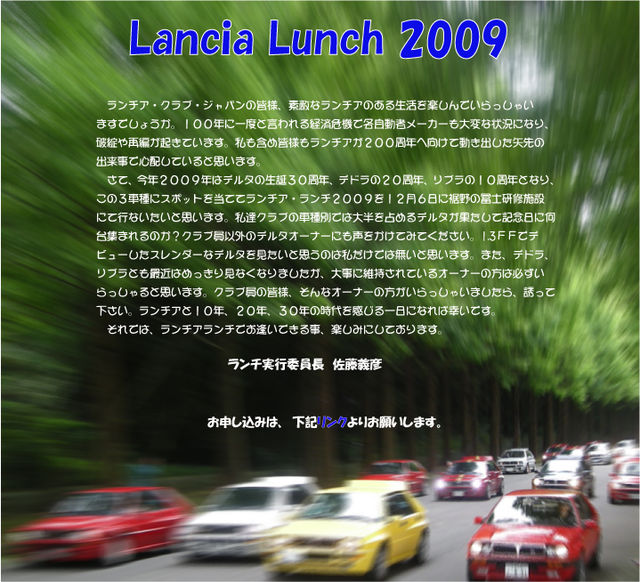 2009年はデルタ30周年、デドラ20周年、リブラ10周年の年なんです。 3車種を特に募集中! なのに・・・ デドラは死に絶えたのか。 デドラオーナさま!誰か参加して、成人式を一緒にお祝いくださいませ。 お申し込みは、↓こちらよりお願いします。 http://www.lanciaclub.jp/ 12月1日現在の申込状況です。 デルタ:42台 (S4=1, FF=1, 16V=9, EVO=27, New=2) リブラ:1台 アウレリア:2台 フラミニア:3台 フルビア:9台 (Sport=4, Coupe=3, 2C=2) ガンマ:1台 トレヴィ:1台 ストラトス:5台 ラリー:4台