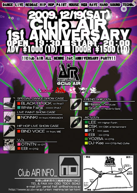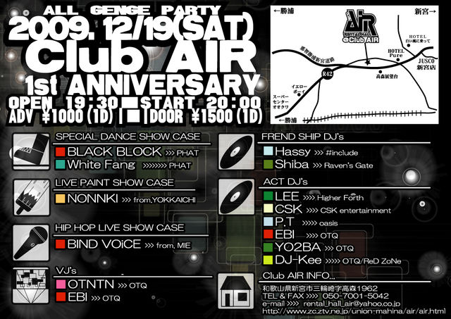 ◆◇Club AIR 1st anniversary◆◇ -ALL GENRE PARTY- 和歌山新宮市のド田舎で始めたClub AIRがなんと1周年! コレはまさにお客さん&数多くのDJやスタッフに支えられた結果だと思います!!! 今回は・・ 大阪ハーコーPARTY“#include”から DJ[Hassy(名古屋)]を召喚!! そして、四日市より年間/数々のライブペイントをこなしながら色々な場所に出没する イラストレーター[NONNKI]☆ 地元からは、9月20日にOPENしたばかりの話題の ストリートダンススタジオ“PHAT DANCE STUDIO”から [BL