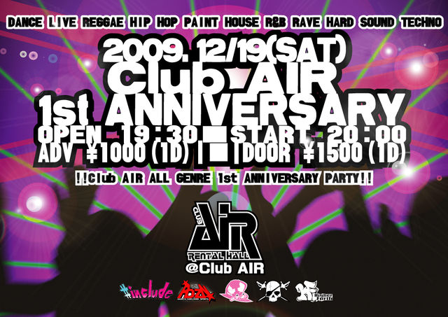 ◆◇Club AIR 1st anniversary◆◇ -ALL GENRE PARTY- 和歌山新宮市のド田舎で始めたClub AIRがなんと1周年! コレはまさにお客さん&数多くのDJやスタッフに支えられた結果だと思います!!! 今回は・・ 大阪ハーコーPARTY“#include”から DJ[Hassy(名古屋)]を召喚!! そして、四日市より年間/数々のライブペイントをこなしながら色々な場所に出没する イラストレーター[NONNKI]☆ 地元からは、9月20日にOPENしたばかりの話題の ストリートダンススタジオ“PHAT DANCE STUDIO”から [B