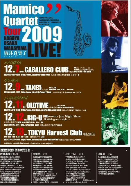 管理人様 スペースをお借りします。 12月に私、坂井真実子がジャズバンドのツアーを行います そのうち、2日間田辺で開催しますので、ご都合が合えば是非、足を運んでいただけると嬉しいです。 12/9(水) TAKE5 @大国町(大阪) MC(ミュージックチャージ)¥2,500 OPEN:19:00 START :19:30〜 住所:大阪市浪速区敷津東3-5-15 KSプラザ2F TEL: 06−6648−1139 http://www.take-5.jp/index2.html 12/11(金) OLDTIME@和歌山市 MC:3,000 OPEN:19:00 START :20:00〜 住所:和歌山