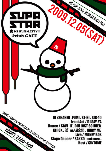 いつもありがとうございます!!! イベント告知失礼致します!!! -HIP HOP . R & B . Reggae and All Mix!!!- [SUPA STAR] @club GATE [ADV]1,500YEN . [With Flyer]2,000YEN . [ADM] 2,500YEN 2009.12.05(Sat) DJ / SHAKER . FUMI . SE-KI . BIG-10 Open / DJ SAY-YA Live / MONEY BOX Dance / SAVE'IT . DIH LOST SOLDiER . XEROX . 淫'mAi蛇邪 . HICKY ME Stage Dancer / foxXy Host / SINTOME ・Information... WKYM's Finest HIP HOP Beatz[SUPA STAR]!!! 個性溢れるライブ、ダンスショーに