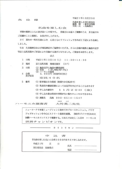 『大竹英二ハーモニカコンサート&ランチ&富士見乳児院見学会』 2009年11時30分〜富士見乳児院見学会 12時15分〜大竹英二ハーモニカコンサート(第一部) 13時〜ランチ(豪華弁当) 13時30分〜大竹英二ハーモニカコンサート(第二部) 参加費 3000円(豪華弁当代金含む)限定40名 募集開始10月20日〜 会場 富士見乳児院ホール(0480-21-0545) 主催&お問い合わせ先 (0480-21-1547)音楽を楽しむ会・幹事(担当・鳥海) 協賛 久喜銀座会 飛高酒店 出演 大竹英二、ハー