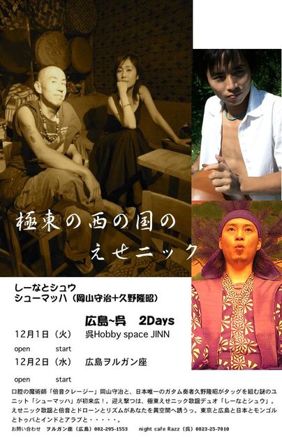 口腔の魔術師、Suara sanaやカムヒビKingで活躍の岡山守治(ホーメイ、口琴、その他)と、日本唯一の本格的ガタム奏者久野まっは隆昭による謎のユニット「シューマッハ」が、ついにその全貌を明らかにする。 迎え撃つは広島が世界に発信する、えせニック歌謡デュオしーなとシュウ。 なんと広島では全編に梶山シュウも参加する「ダブルシューマッハ」として、さらにディープな世界を展開の予定。 中国地方では此処でしか見れない貴重な邂逅です。 倍音と低音とリズムとハーモニー、インドとアラブとアジアと日本、広島と東京が錯綜する世