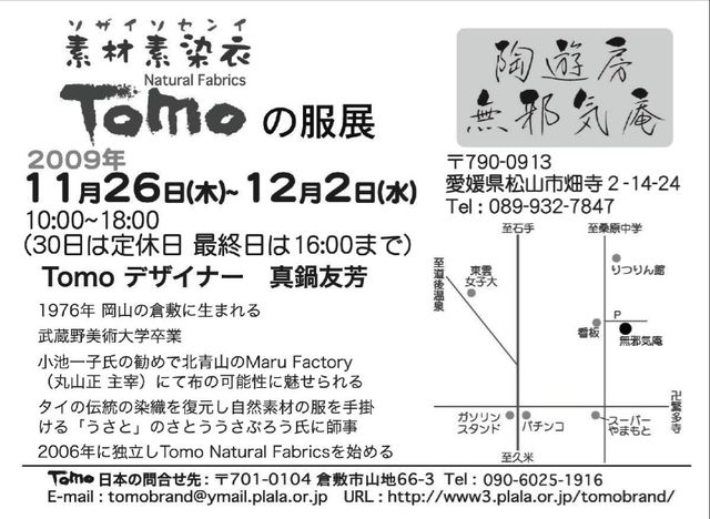 今、松山市で展示会をやっています。 興味がある方、お寄り下さい。 会場・・・『陶遊房 無邪気庵』松山市畑寺2−14−24 会期・・・11/26~12/2 10:00~18:00(30日は定休日・最終日は16:00まで) Tel・・・090-6025-1916 天然素材(コットン・ヘンプ・シルク)を天然染料(草木)で染め、ひとはたひとはた織られた生地を使い、デザイナーTomo(眞鍋友芳)が立体裁断で着心地とシルエットにこだわってデザインした服の展示会です。 デザイナーTomo(眞鍋友芳) 1976年 岡山の倉敷に生まれる 武蔵野美術大学卒業 小池一