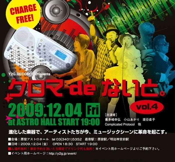 クロマdeないと。vol.4 2009年12月4日金曜日 原宿アストロホール OPEN 18:30/ START 19:00 入場料無料! 予約すると1ドリンク無料!!! 予約は→http://y2g.jp/ja/event091204/ 【出演】 喜多崎幸弘!!!!! 小山あかり 堤谷直子 Complicated Protocol and more・・・ 早くも、VOL.4ですねえ。 ぜひっ!!!!!