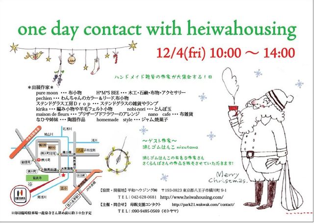 「One day contact」with heiwahousing 平和ハウジング 八王子市横川町9-1 10:00〜14:00 無料駐車場近隣約20台 西八王子駅より徒歩約15分 手作り大好きママが集まって 1day shopを開催いたします。 消しゴムはんこmizutama さくらんぼさんの作品も ゲスト参加いたします♪ なかなか手に入ることが出来ない作家さんの作品です。 是非遊びに来てください♪ イベントブログ http://onedayshop1.blog32.fc2.com/