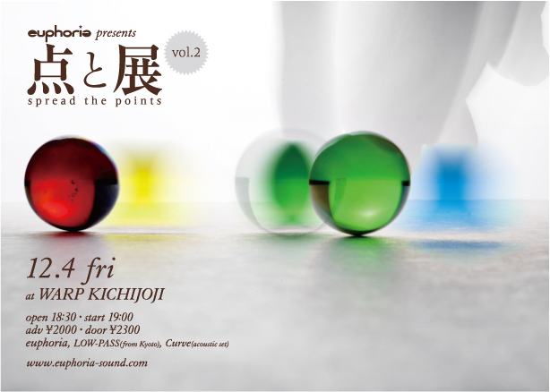 euphoria自主企画、「点と展 vol.2」開催のお知らせです! 12/4(金)、場所は吉祥寺WARPになります。 今年最後のeuphoria企画、3マンでの開催です。 euphoria presents "点と展 -spread the points- vol.2" ●12.4(金) at 吉祥寺WARP http://warp.rinky.info/ [open・start] 18:30・19:00 [adv・door] ¥2000・¥2300 (+1drink ¥500) [act] euphoria, LOW-PASS(from Kyoto), Curve(acoustic set) [tickets] ローソン(L:74926), イープラス ※euphoriaの自主企画 新シリーズ第2回目!3マン!! チケット予約