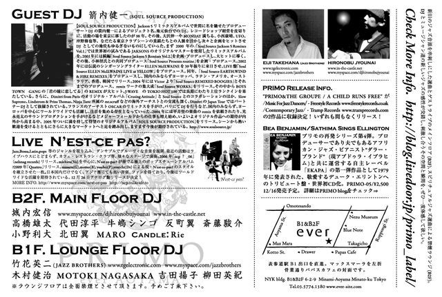 「ジャズやソウルのグルーヴ感や生のライブを楽しめる空間。僕らはみんながリラックスして音楽を楽しめる場所を作って行こうと思う。なぜなら,そ こに集まる人々は様々な物事に対してとてもオープンな考えを持ってるはずだから... 」を合言葉に、新たな試みと空気感を提案し続けるマンスリーイベント。(毎月第一金曜@ever青山)