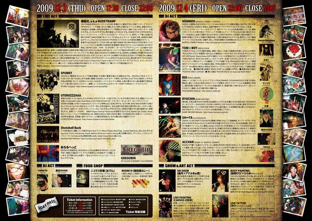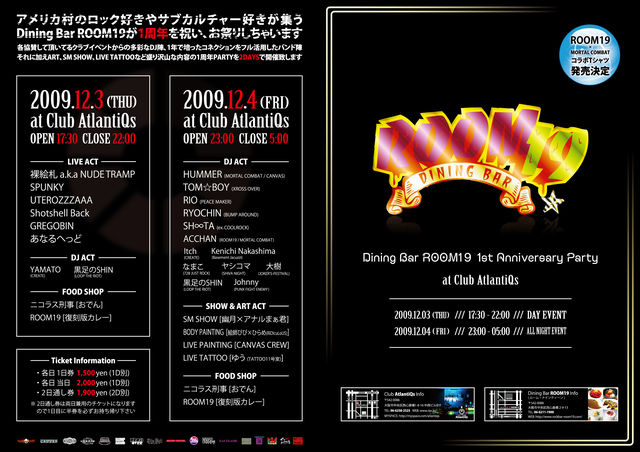 アメリカ村のロック好きやサブカルチャー好きが集うDining Bar ROOM19が1周年を祝い、お祭りしちゃいます 各協賛して頂いてるクラブイベントからの多彩なDJ陣、1年で培ったコネクションをフル活用したバンド陣 それに加えART、SM SHOW、LIVE TATOOなど盛り沢山な内容の1周年PARTYを2DAYSで開催致します 2009.12.3 (TUE) at Club AtlantiQs OPEN 17:30 CLOSE 22:00 ADV 1,500yen (1D別) DOOR 2,000yen (1D別) 2日通し券 1,900yen (1D別) ■ LIVE ACT ■ 裸絵札 a.k.a NUDE TRUMP 裸絵札 myspace http://www.myspace.co