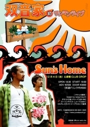 双音家の初ワンマンライブが決定しました ↓↓詳細は↓↓ 双音家 初ワンマンライブ "Sun's Home" [日程]2009年12月4日(金) [会場]心斎橋CLUB DROP [時間]OPEN18:30 START19:00 [料金]前売り¥2,500 当日¥3,000 (別途ドリンク代¥500) [購入方法] SOLD OUT [主催]YUMEBANCHI [企画制作](株)吉本音楽出版 [協力]FILTER88 双音家初ワンマン開催記念グッズ発売決定 詳しくは・・・ http://mixi.jp/v