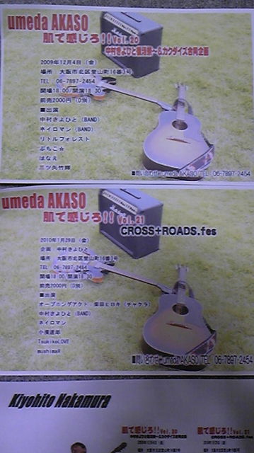 まだ治療中ですが… 治療終了後、すぐに体調回復するわけないですが… 中村きよひと復活ライブ決定致しました! 地元が同じの情熱家小林道秀氏と合同企画!! 半年間治療で身体はボロボロで、練習期間はたったの一ヶ月、、、。 だけどそんなの関係ない! 精一杯歌いたいと思います! 時間が合う方、応援よろしくお願いいたします! ■この日のBAND編成は ギタートリオ×リズム隊×キーボード! ギタートリオで演りまーす♪ ●2009年12月4日(金) ◆Umeda-AKASO http://akaso.jp/ (旧バナナホール) 肌で感じろ!!