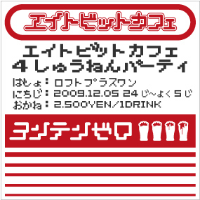 ================================================== いつもお世話になっております☆8bit cafeのコジョウ、ナヲです☆ この度8bit cafeは、皆様のおかげで4周年を迎える運びとあいなりました。 今後の世界の文化を創っていく皆さんの発信基地、新宿3丁目の隠しステージ 大人の放課後のたまり場、8bit cafeを 今後ともよろしくお願いします!! ということで、来る12月5日(土)24時00分〜翌5時00分まで 8bit cafe 4周年記念PARTY【 ヨンテンゼロ! ! ! 】を開催いたします!! ---------------------------------------------