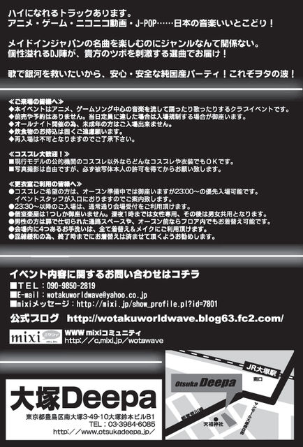 年内はこれでラストです。 レギュラーDJで今年1年の総決算でいきます!! 忘年会的に打ち上げたいですね☆ ------------------------------------------------------------ ハイになれるトラックあります。 アニメ・ゲーム・ニコニコ動画・J-POP……日本の音楽いいとこどり! メイドインジャパンの名曲を楽しむのにジャンルなんて関係ない。 個性溢れるDJ陣が、貴方のツボを刺激する選曲でお届け! 歌で銀河を救いたいから、安心・安全な純国産パーティ!これぞヲタの波! --------------------------------------------------