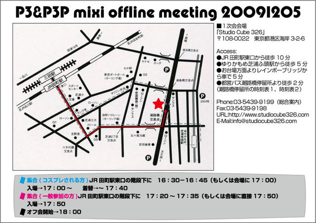 こんばんは、たけし@マソーです。 今年は劇中年ということで、7月にオフ会をやらさせていただきましたが、 やっぱり劇中年ってことでサプライズが待ってましたねwP3P!! ってことで皆さんがクリアしたかな〜って頃合で感想を語らう会をしたいと思います♪ 1ヶ月ってことでゆっくり目の方はもう少しかかるかもしれませんが、 変更点や新規イベントなどについて語らいましょう♪ ★★★イベントの詳細★★★ ■■■日時■■■ 12月5日(土)18:00〜21:00(時間調整中) ■■■集合■■■ JR田町駅東口(時間は