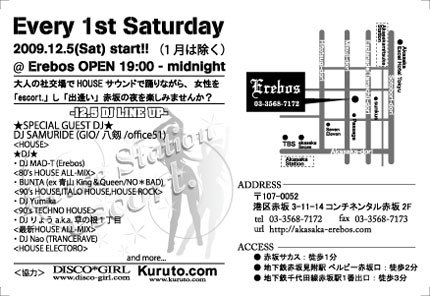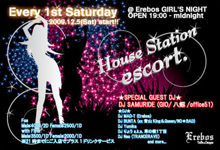 <12/5(土)HOUSE STATION"escort."@Erebos GIRL'S NIGHT> 毎月第一土曜日は、赤坂Erebos GIRL'S NIGHT! 大人の社交場でHOUSE SOUNDで踊りながらデートしたり、出逢い探しをしませんか? 新たな「出逢い」をして、女性を「escort.」し赤坂の夜を楽しみませんか?! 赤坂Erebos駅のホームでは、出会いを求める男女や、デートをする男女が賑わう! その赤坂Erebos駅で、男性が気になる貴女をescort.(エスコート)して、エクゼクティブな旅立ちをしようとする! そのホームが、赤坂エレボスのダンスフロア! また、恋人同士がHO