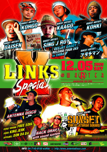 12/5(sat) KASHIWA REGGAE DANCEHALL X-LINKS (DEEJAY DADDY TOUR 2K9 in CHIBA) @千葉県柏市WARTER http://mixi.jp/view_community.pl?id=344108 OPEN/23:00 当日2500円 -GUEST SOUND- SUNSET THE PLATINUM SOUND -GUEST ARTIST- SING J ROY DAISEN KAAGO KOHKI アダチマン KOHGO -SOUND- ANTENNA DISCO fr Tokyo BACK DRAFT with Soundsystem fr Ibaraki -EARLY WARM- FREE SOUL fr Fukushima SOUND SYSTEM:BACK DRAFT EMERGENCY http://mixi.jp/view_album_photo.pl?album_id=9991603&own