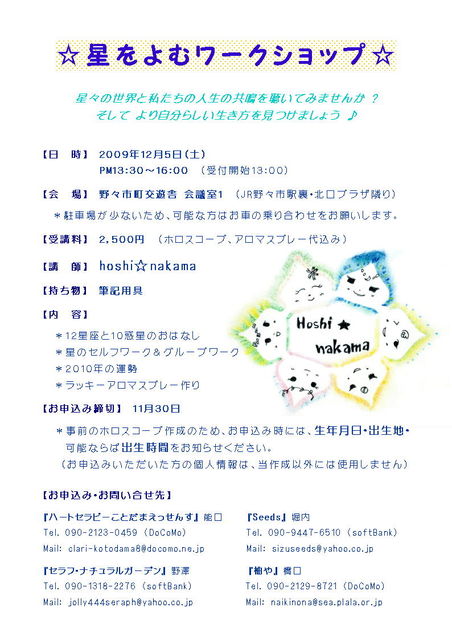 一緒に占星術を学んできた6人の『hoshi☆nakama』たちで、12月に『星をよむワークショップ』を行うことになりました♪ 私たちが学んできた占星術のおもしろさ、奥深さ、そして自分らしく生きることの素適さを、たくさんの人たちとシェアしたいです♪ よく知られている12星座占いは太陽星座だけを観ています。 でも本当はたくさんの星々が私たちの誕生を彩っています。 生まれた瞬間に星々がどの星座の影響をうけているのかを知ると、自分のいろいろな可能性や性質が見えてきます。 『星をよむワークショップ』では、自分の性質を見たり感じ