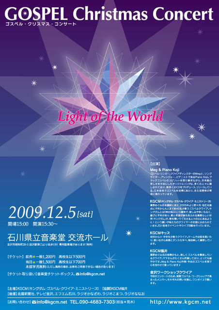 【日時】2009年12月5日(土) 開場15:00〜 開演15:30〜 【会場】石川県立音楽堂ホール (金沢駅東口から徒歩1分) 【チケット】前売 一般1,200円 小・中学生500円 当日 一般1,500円 小・中学生700円 【チケット取扱】音楽堂チケットボックス、info@kgcm.net 出演:Meg&Piano Koji、KGCM、KGCM福井、KGCMキッズ、金沢ワークショップクワイア 主催:KGCM(キングダム・ゴスペル・クワイア・ミニストリーズ) 協賛:KGCM福井 後援:北國新聞社、テレビ金沢、エフエム石川、ラジオかなざわ、ラジ