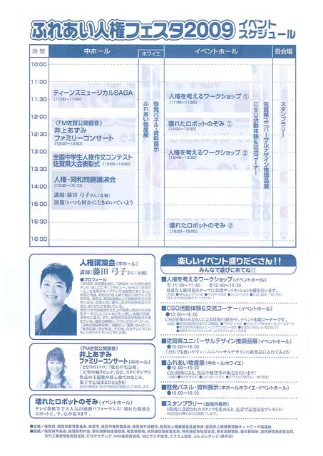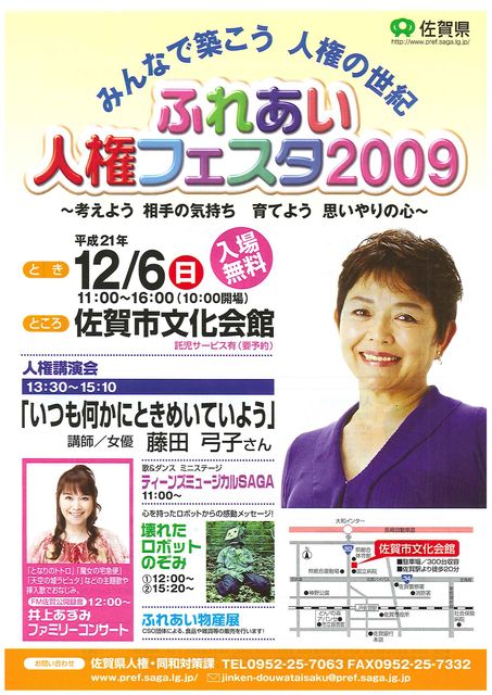 みんなで築こう人権の世紀 【ふれあい人権フェスタ2009】 〜考えよう 相手の気持ち 育てよう 思いやりの心〜 12/6(日)11:00-16:00(10:00開場) 佐賀市文化会館 【入場無料】 13:30-15:10 中ホール 人権講演会「いつも何かにときめいていよう」女優 藤田弓子さん 11:00-11:45 中ホール ティーンズミュージカルSAGA 12:00-12:50 中ホール 井上あずみ(となりのトトロ、魔女の宅急便、天空の城ラピュタなどの主題歌・挿入歌)ファミリーコンサート 11:00-11:50 12:40-13:30 イベントホール 人権を考え