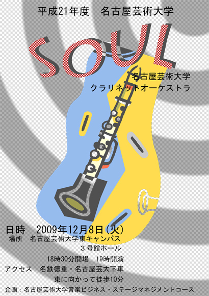 名古屋芸術大学クラリネットオーケストラ SOUL 2009年12月8日(火曜日) 18時30分会場 19時開演、21時終了予定 名古屋芸術大学東キャンパス 三号館ホール 入場無料、クラリネットのみのオーケストラが聴けますの是非お越し下さい。