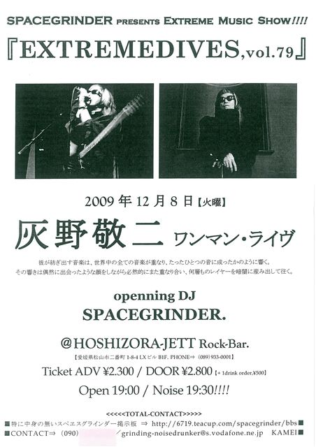 灰野敬二氏、2年半ぶりの四国松山ライヴが開催されます。 多数の皆様に共鳴して頂く事を切に願っております。 どうか宜しくお願いします!!! ■2009/12/08(Tue)@松山 星空JETT Rock-Bar 【愛媛県松山市二番町1-8-4 LXビルB1F/PHONE⇒(089)933-0001】 ⇒ http://hoshizorajett.ddo.jp/ ⇒ http://mixi.jp/view_community.pl?id=460379 SPACEGRINDER presents… 『EXTREMEDIVES,vol.79-special!!!!』 〜underground cult pop,#14〜 starring ⇒ ◆灰野敬二 【from 東京】 (※ワンマン・ライヴ。) ⇒ http://fus